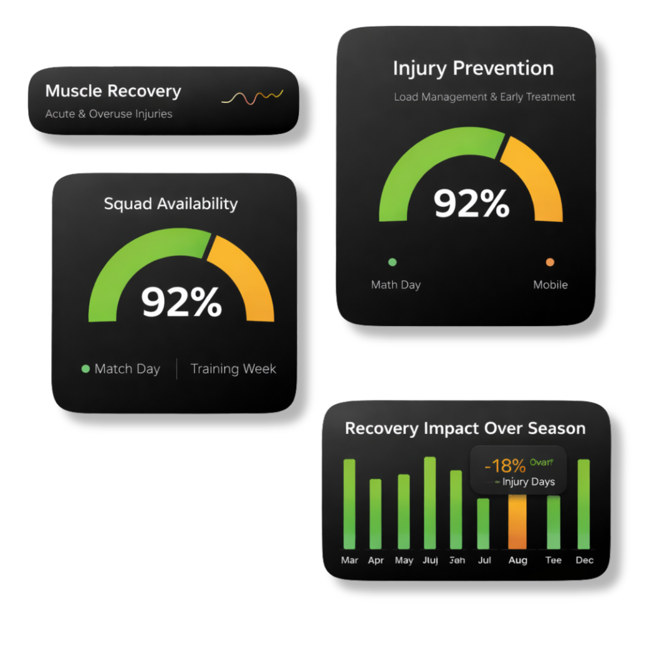 By addressing recovery and rehabilitation early and across the entire squad, our system improves resource efficiency, reduces indirect injury costs, and delivers a clear return on investment.